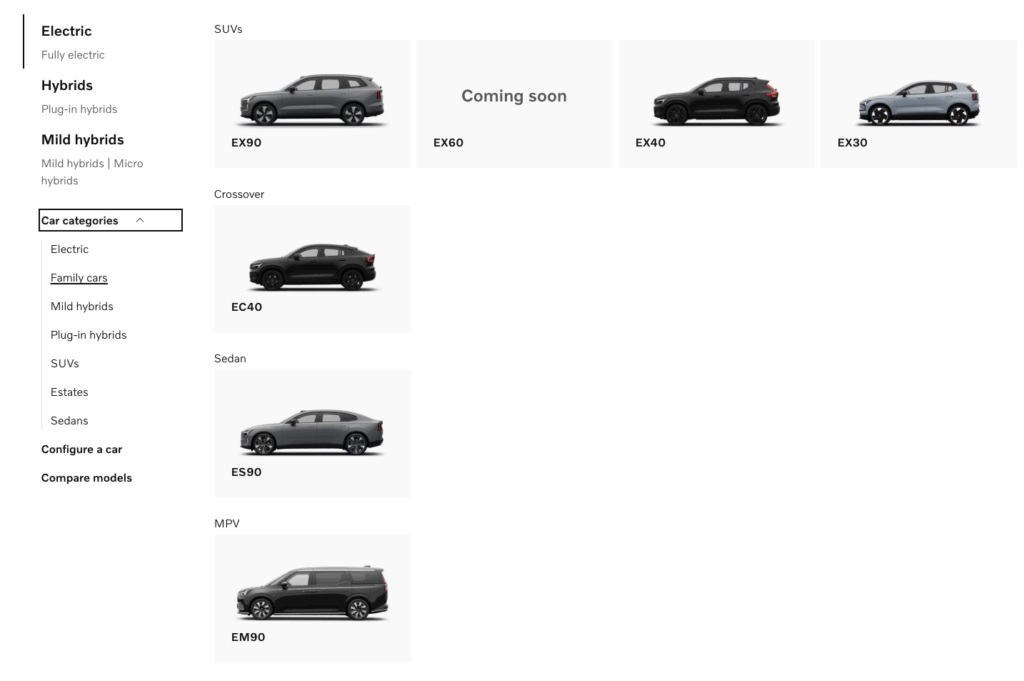 - Кроссоверы они же SUV-ы EX30, EC40, XC40, EX40, XC60, XC90, EX90